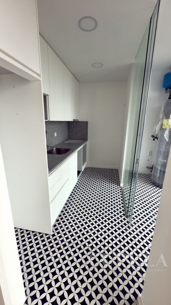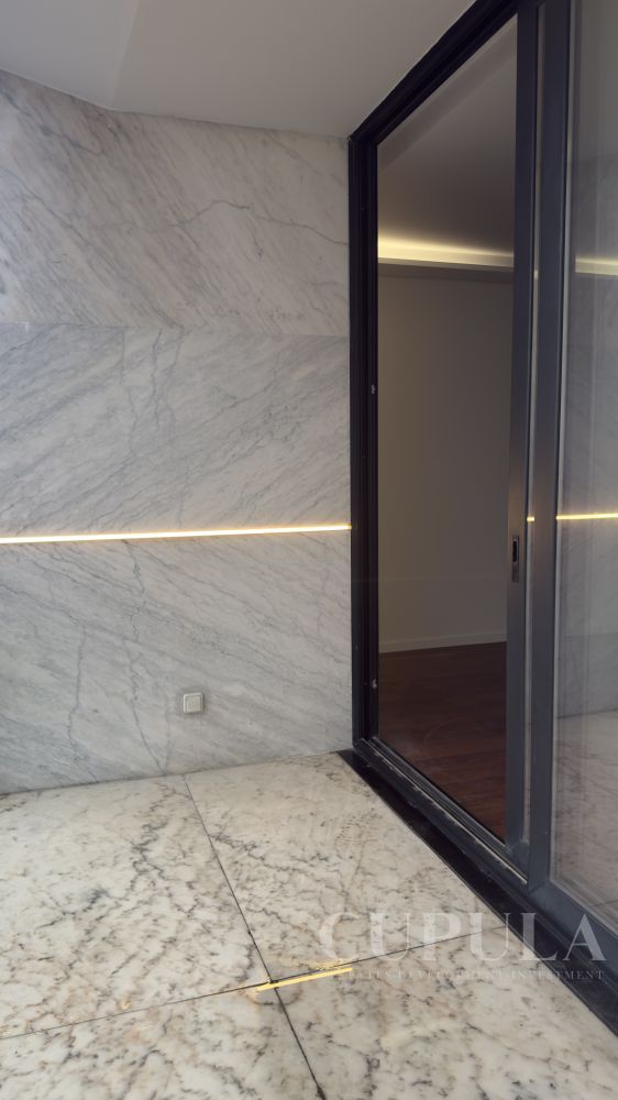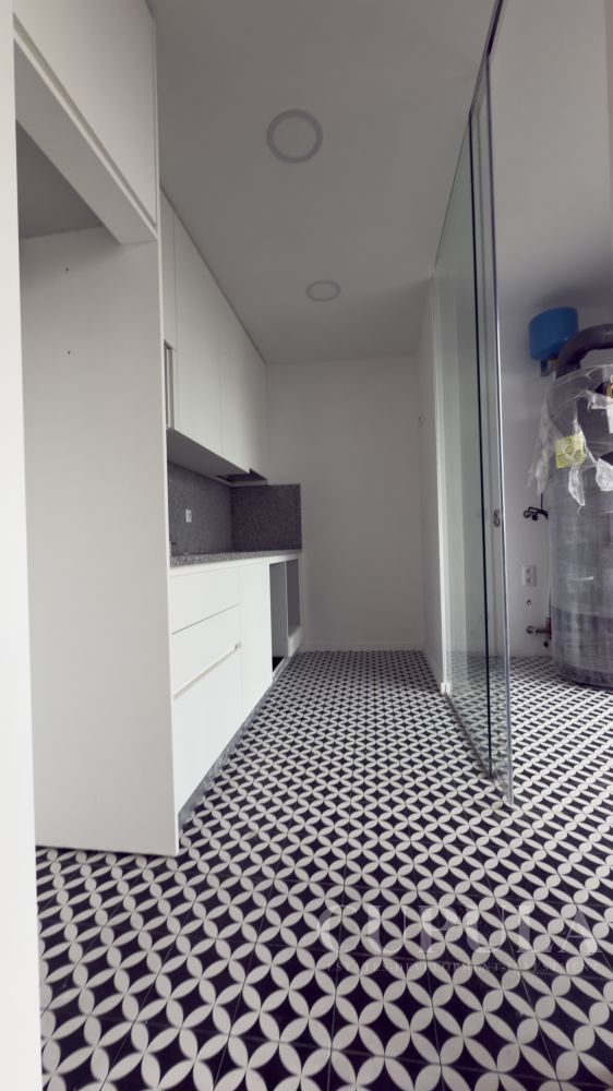 A cozinha com acesso a lavandaria. A sala acolhedora é o espaço ideal para relaxar após um longo dia. Com piso radiante em todas as divisões, o apartamento garante um ambiente sempre agradável.